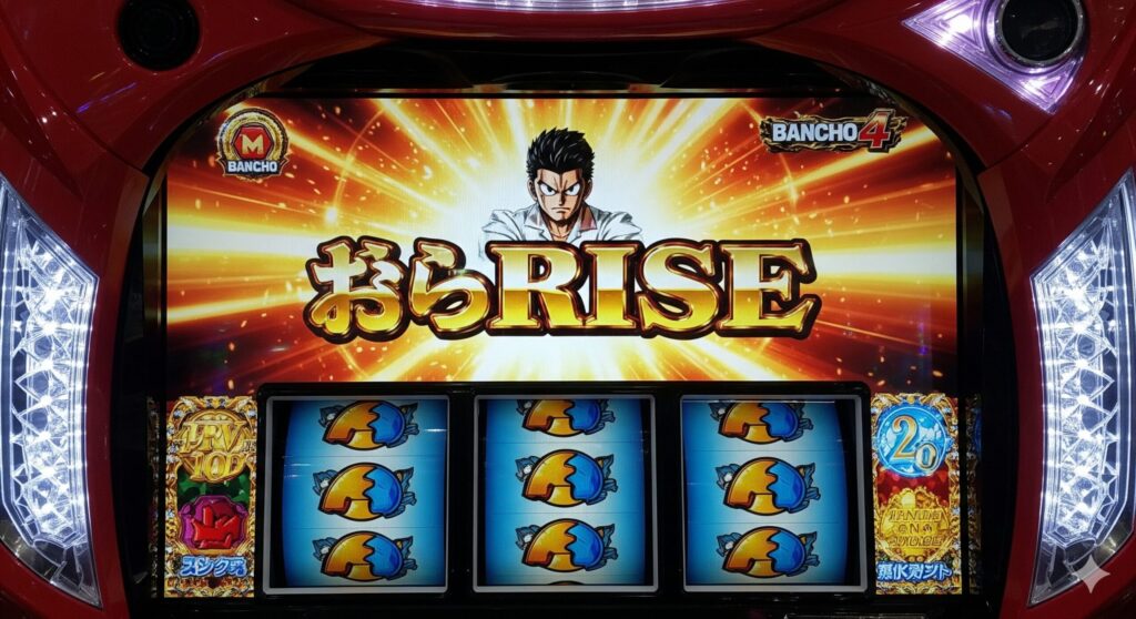 番長ボーナス中の7揃いはAT当選を、AT中のボーナスでの7揃いは対決ストックや轟雷光といった恩恵をもたらす重要なアクションです。特に、告知タイプ「操」を選択した際の最終告知「アンコールーレット」で虹色の「頂RISE」ロゴが停止した瞬間は、青7揃いを含む2回以上の7揃いに当選していたことが示唆されるため、喜びもひとしおです。