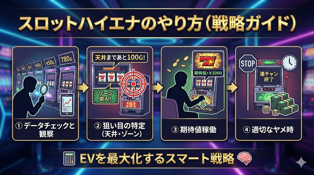 | ④ やめ時 | 連チャンが終わったタイミングなど、キリのいいところでOK | 天井・ゾーン・有利区間の切れ目などを意識してやめ時を決める |